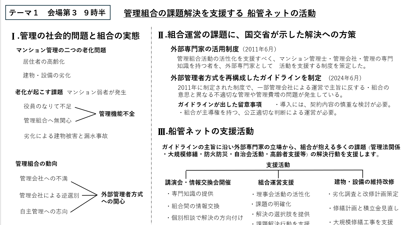 ・管理組合間の情報交換 ・管理組合が抱える問題認識 ・解決の為の専門知識の提供 ・問題解決行動の支援
